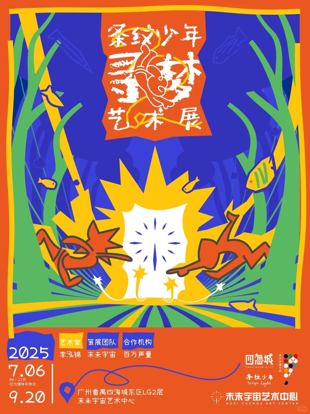你可以走进一个少年的脑海——在那里,线条会说话,动物在开会,沙子藏着任务地图。 他的作品采用多巴胺色彩,采用独特的条纹元素,即兴创作出丰富多彩的作品。