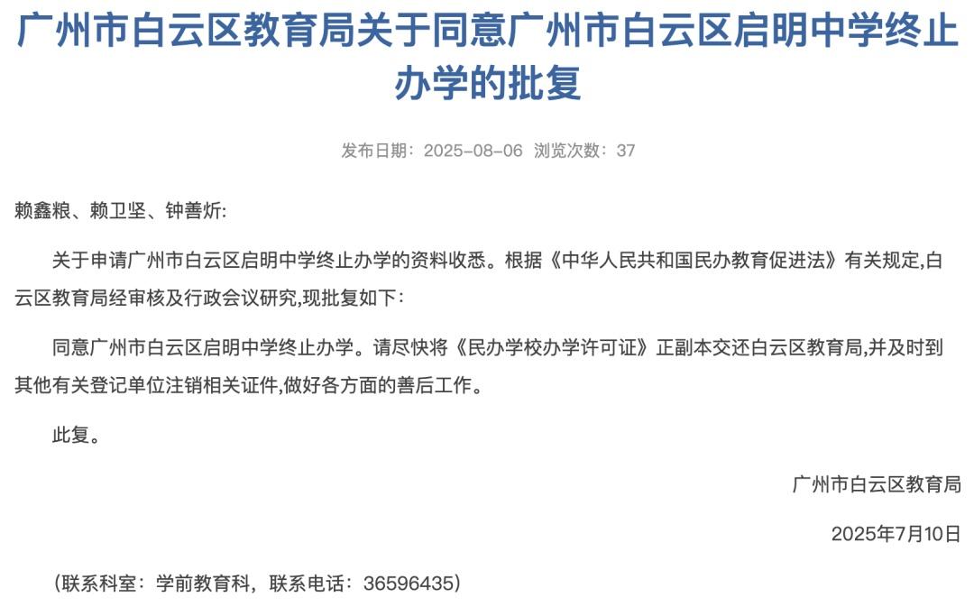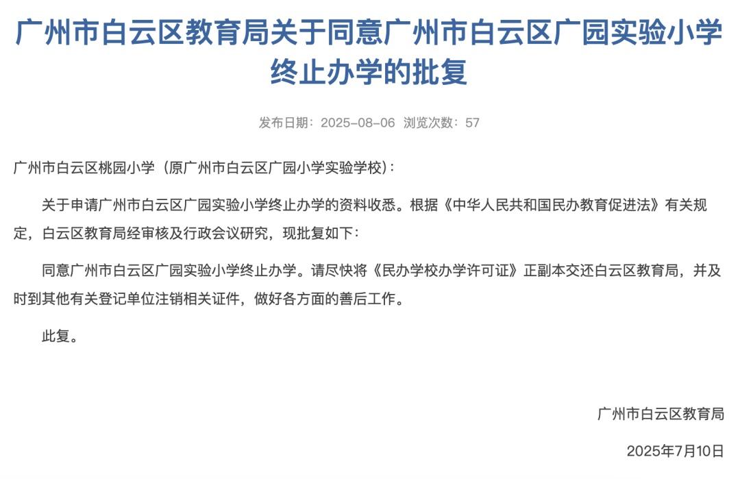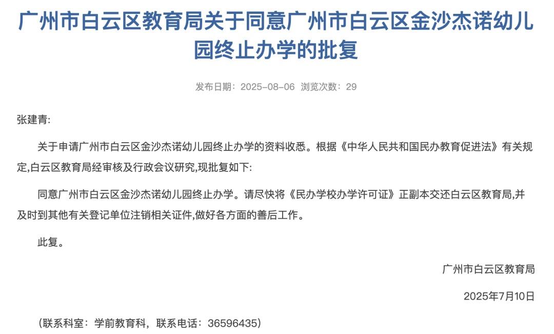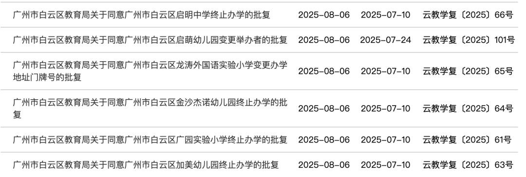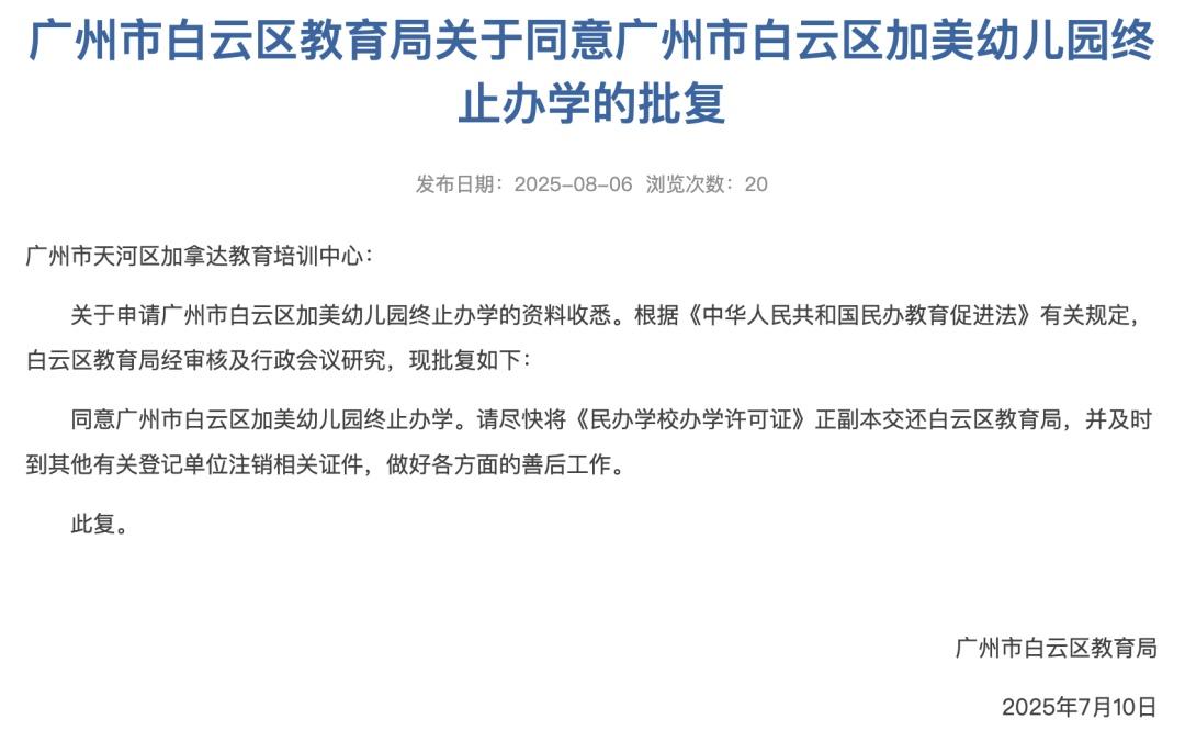 8月6日,广州市白云区教育局信息公开平台发布了关于4所学校终止办学的批复,4所学校分别为广州市白云区启明中学、广州市白云区广园实验小学、广州市白云区加美幼儿园、广州市白云区金沙杰诺幼儿园。