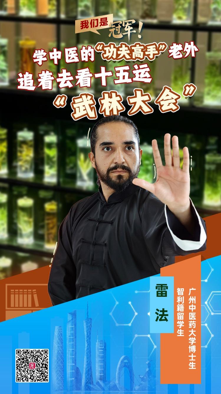 采访即将结束,临别之际,雷法展臂起势,舞了套南拳,一招一式雄劲有力。他身后则是广州中医药大学校训“厚德博学、精诚济世”八个大字。这位曾在地球另一端练习中国武术的智利少年,将把中国文化的种子装进回乡的行囊。