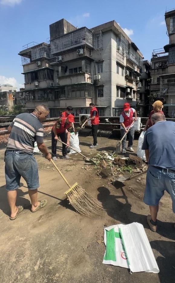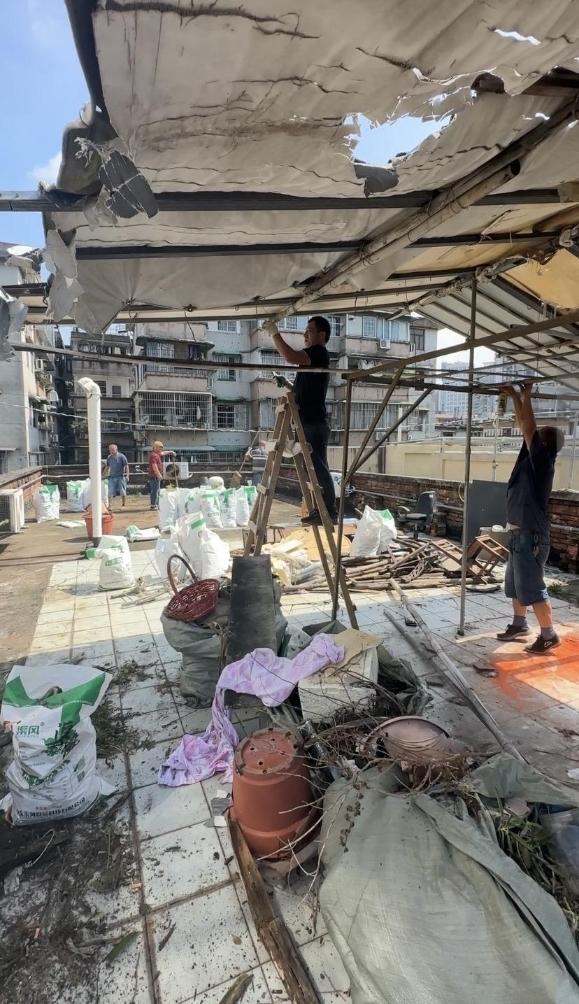 昨天上午,记者在荔湾区昌华街道西关大屋社区的一处居民楼顶天台看见,约10名壮汉正在对约100平方米的天台区域进行清理,征得居民同意后,对居民闲置的旧床垫、日久欠打理的花棚等进行了清理。