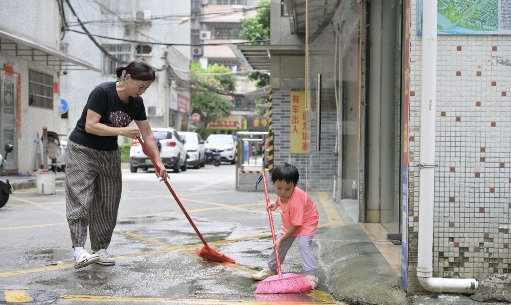 居民与孩子清理店门口积水