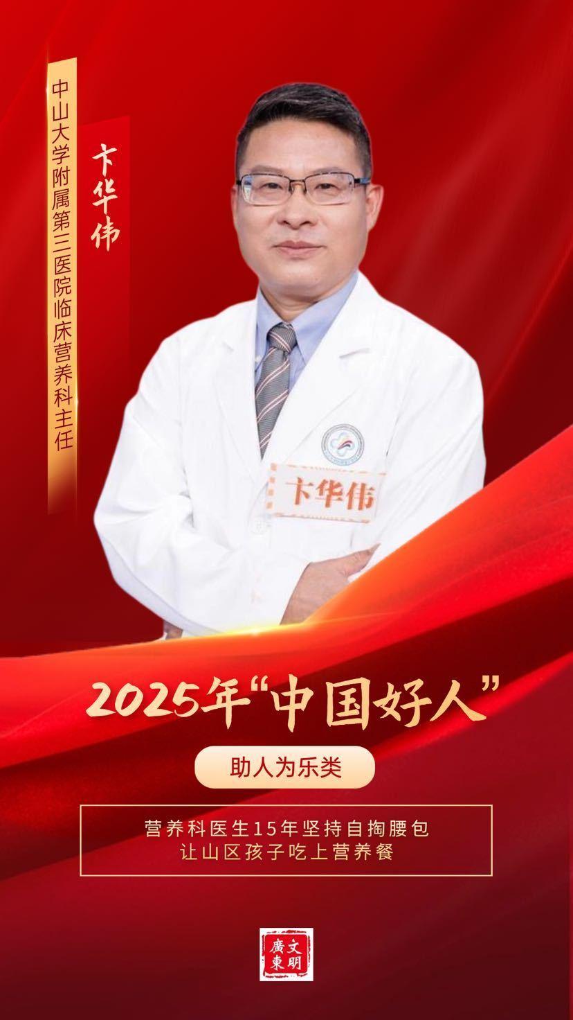 不久前,中央精神文明建设办公室发布2025年首次“中国好人榜”,广东共有6人光荣上榜。其中,来自广州的卞华伟当选助人为乐好人。身为中山大学附属第三医院临床营养科主任的卞华伟,15年如一日,自掏腰包资助山区儿童,倾情护航他们健康成长。
