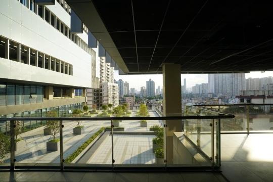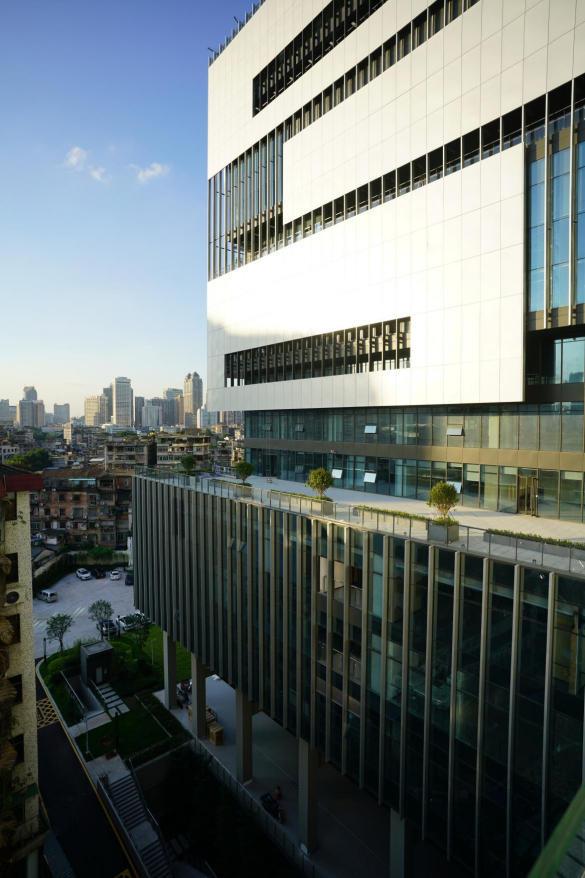 据了解,设计团队将传统岭南建筑中遮阳、隔热、通风、理水的空间智慧与现代绿色建筑设计手法合二为一,借由空间手法营造场地“微气候”,在保障舒适度的同时减少耗能设备依赖:首层骑楼与“十字形”架空巷道形成交融城市的景观通风廊道,协同广场与下沉庭院引导东南风,构建出无需空调的内外联通被动调节系统;建筑通过自身凹进遮阳,结合架空层、敞厅、通高空间等设计强化自然通风,显著提升内部热环境舒适度。