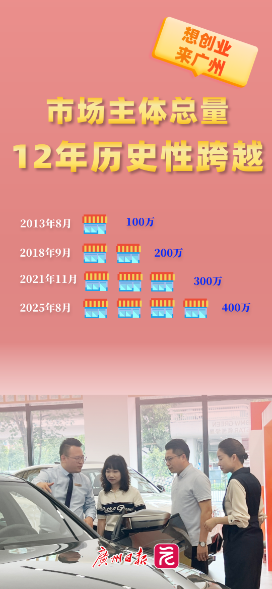 依托千年商都底蕴和粤港澳大湾区战略机遇,广州这片拥有400万市场主体共生共荣的热土,正以更加开放的姿态、更具竞争力的营商环境,热忱欢迎海内外企业家、创业者来穗投资兴业,携手迈向 500万户市场主体新征程,共享发展红利,共创繁荣未来。