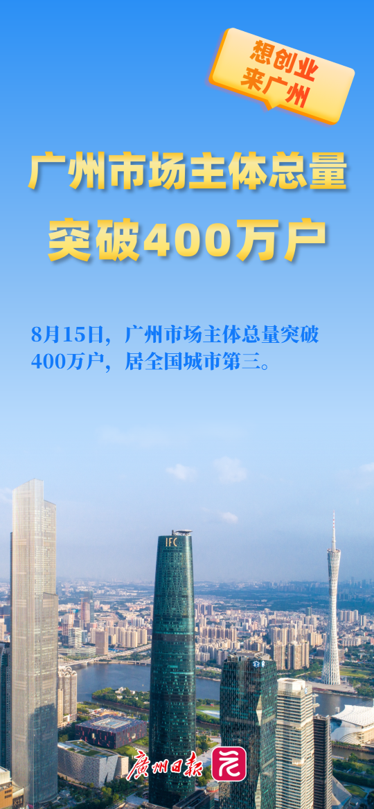 8月,广州市场主体总量成功突破400万户大关,跃居全国城市第三,以强劲数据诠释着“千年商都”的活力与潜能、展现着磅礴的“广州引力”。