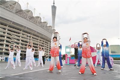 活动现场,青春洋溢的啦啦操《一起来,更精彩》率先点燃全场,青年志愿者们整齐划一、充满激情的表演,瞬间将喜迎全运的氛围推向高潮。广东省街舞协会的少年们带来了动感十足的街舞《舞动一夏》。广州中医药大学第一附属医院的志愿者们则引领市民沉浸式体验传统养生文化,不仅现场展示了国家级非物质文化遗产——八段锦的完整套路,更邀请台下市民一起互动学习,在推广科学健身理念的同时,积极倡导健康生活方式,为迎接全运盛会营造了浓厚的全民健身风尚。