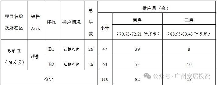 嘉翠苑项目销售基准价为17300元/平方米,本次供应第二批房源110套,房屋户型、套数等情况详见下表: