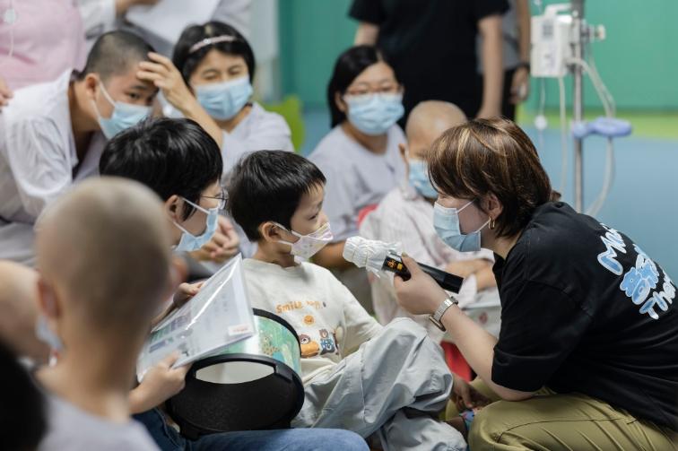 在儿童重症病房歌唱小组中与患儿互动的时静洁