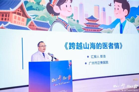 在致敬援派医务人员环节,广州市正骨医院彭浩医生分享了他在贵州安顺开展医疗帮扶的经历。通过建立正骨手法工作室、开展脊柱康复训练等“造血式”帮扶,他为当地培育医疗人才、提升诊疗水平作出了积极贡献。