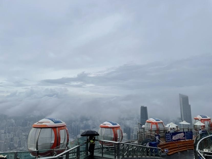 8月20日下午,羊城骤雨初歇,在广州塔450米户外观景平台俯瞰城市,云雾弥漫在建筑之间。立于云端之上,广州的磅礴气象化作美丽的水墨画卷。