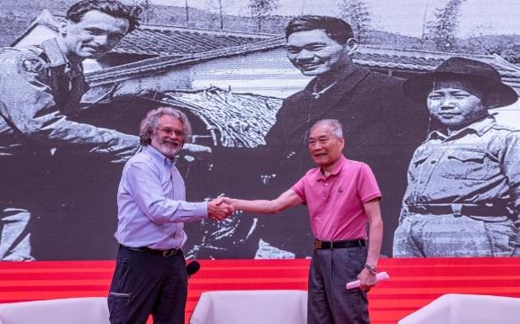 东江纵队司令员曾生之子曾德平和美国飞虎队飞行员唐纳德·克尔中尉之子戴维·克尔亲切握手,“复刻”了81年前曾生与唐纳德·克尔握手的历史瞬间。