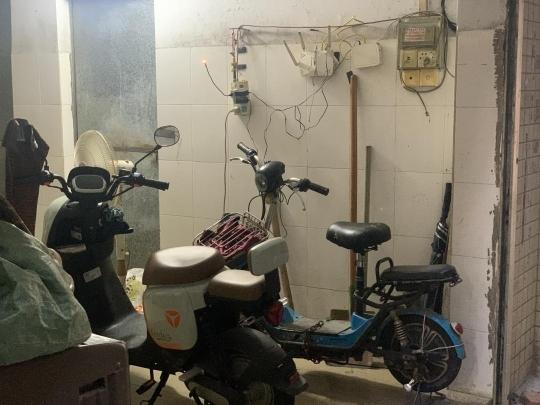还有居民将电动自行车停放至屋内,并且在屋内充电。有的出租屋楼宇首层停满电动自行车,有的楼宇在室内设置了插座,供室内的电动自行车充电。