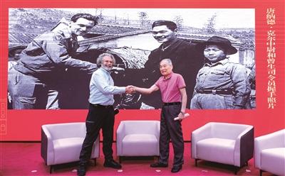 东江纵队司令员曾生之子曾德平和美国飞虎队飞行员唐纳德·克尔中尉之子戴维·克尔亲切握手,“复刻”了81年前曾生与唐纳德·克尔握手的历史瞬间。广州日报全媒体记者廖雪明 摄