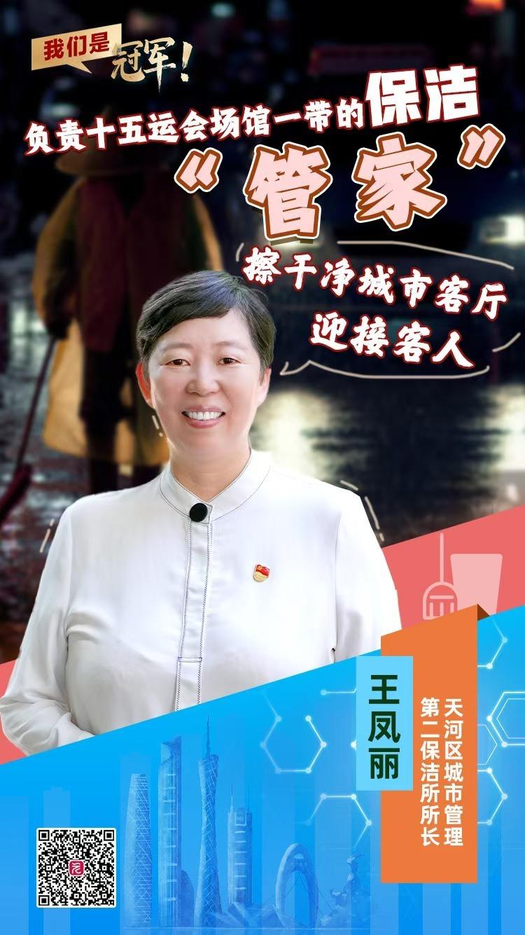 王凤丽是广州市天河区城市管理第二保洁所所长,负责的范围包括体育中心周边、体育东路、体育西路,火车东站一带以及华南国家植物园,总面积超过300万平方米,同时还支援承办多项全运会赛事的天河体育中心的保洁工作。