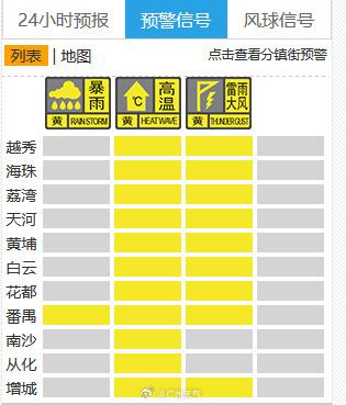 到8月25日14时,白云区、海珠区、黄埔区、花都区、荔湾区、番禺区、增城区也发布了雷雨大风黄色预警信号。请居民注意尽量避免外出,及时停止户外作业。