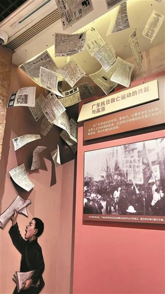 专题展现场展出多个重磅展品,包括《中国共产党为日军进攻卢沟桥通电》(1937年7月8日)、《为抗日救国告全国各校学生和各界青年同胞宣言》(1935年12月20日)、抗日战争时期《广东青年抗日先锋队队歌》雕版印刻,以及广东青年抗日先锋队队徽印章等。现场综合利用多媒体和展项设计,打造多个场景装置,以增强沉浸式观展体验——通过声光电综合场景,结合华南文化抗战介绍短片,并运用抗战版画、期刊杂志、救亡音乐等作品,构建出沉浸式观展空间,全方位展现文化界人士以笔为枪、以剧援战、以歌动员、以画为媒,积极投身文化抗战的历史。