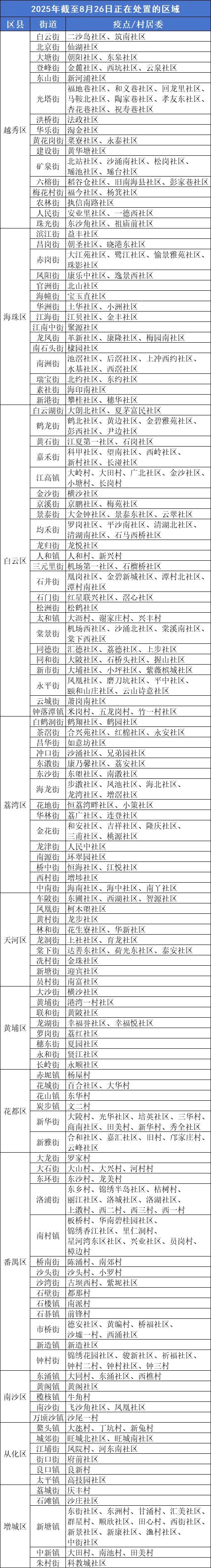 当前已进入登革热等蚊媒传染病流行季节。广州疾控最新提醒,截至8月26日,市内以下区域正在开展蚊媒传染病疫情处置,存在传播风险,请市民注意防蚊灭蚊。