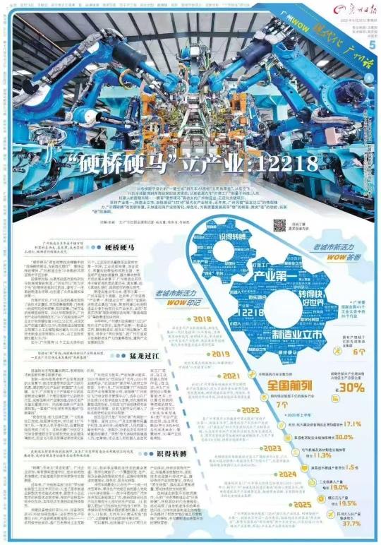 坚持产业第一、制造业立市,加快建设“12218”现代化产业体系,近年来,广州凭借“猛龙过江”的转型魄力、“识得转膊”的创新智慧,正加速迈向产业数智化、绿色化,为高质量发展筑牢“稳”的根基、激发“进”的动能、拓展“新”的版图。
