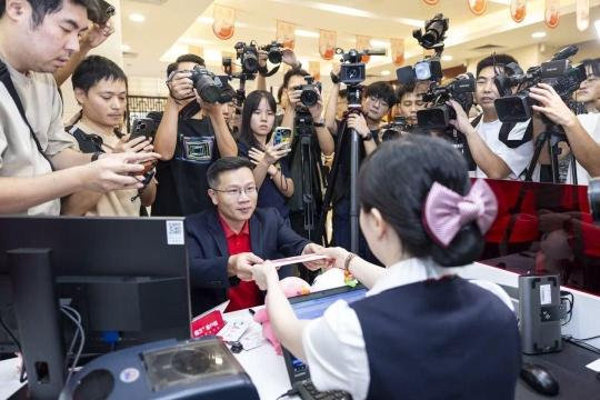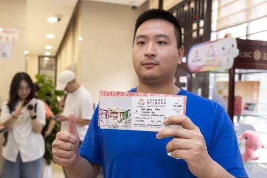 在位于广州东风东路丝绸大厦的中国工商银行线下销售网点,陈先生成为这里第一个成功购票者,他说很想买到十五运会的首张线下门票,觉得线下购票体验感更好,“我年初就一直在关注这个事情,知道今天开售后就第一时间联系了银行,今天一早就来霸头位,还特意穿了红色衣服,取红红火火的好意头”。陈先生想买两张现代五项比赛的门票,因为一下子能看5个项目,他个人最喜欢的是马术,有点遗憾的是,他想购买的场次已经没票,最后是更换了场次方才如愿,在提供身份证信息、选好场次坐席等、成功付款后,陈先生终于拿到了打印上他实名信息的十五运会赛事纸质门票。陈先生非常开心、兴奋,他的门票上印的是广东奥体中心的建筑图案,他说设计很漂亮,感觉高端又时尚,除了现代五项,陈先生还喜欢看羽毛球和跳水,后面还会继续抢票。