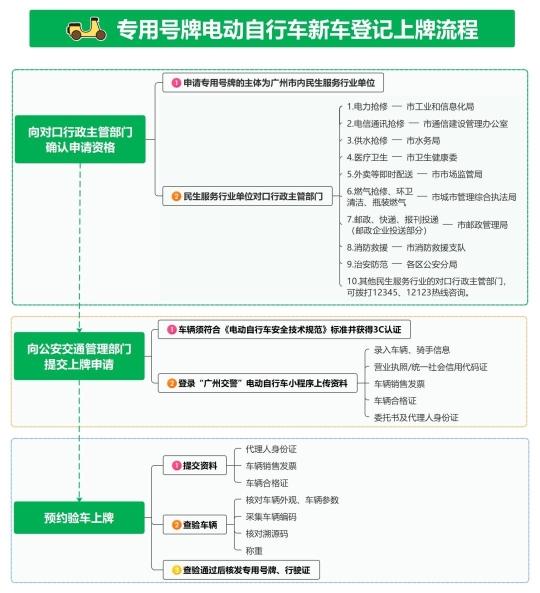 民生服务行业单位向行政主管部门确认资格→行政主管部门资格确认→民生服务行业单位组织骑手参加不少于2小时的道路交通安全、消防安全、电动自行车法律法规学习→民生服务行业单位向公安机关交通管理部门提交申请→预约到网点上牌。具体民生服务行业单位的确认,由对口行政主管部门负责。