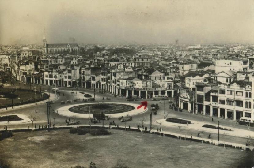 20世纪50年代初的海珠广场(红色箭头所指为广州起义路口),图片由广州市档案馆提供