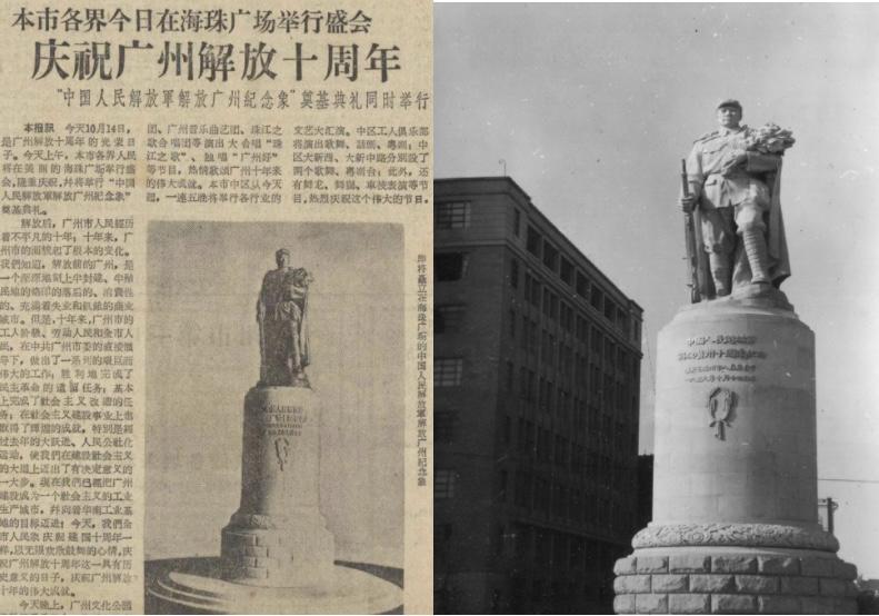 左图为《广州日报》关于海珠广场庆祝广州解放十周年和“广州解放纪念像”奠基典礼的报道,由广州市档案馆提供。右图为矗立在海珠广场中央的广州解放纪念像,由广州雕塑院提供。