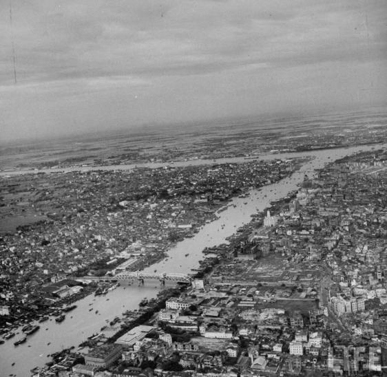 1949年航拍广州海珠桥及珠江两岸地区,从图可看出当时海珠桥北端一片废墟。图片由广州市档案馆提供