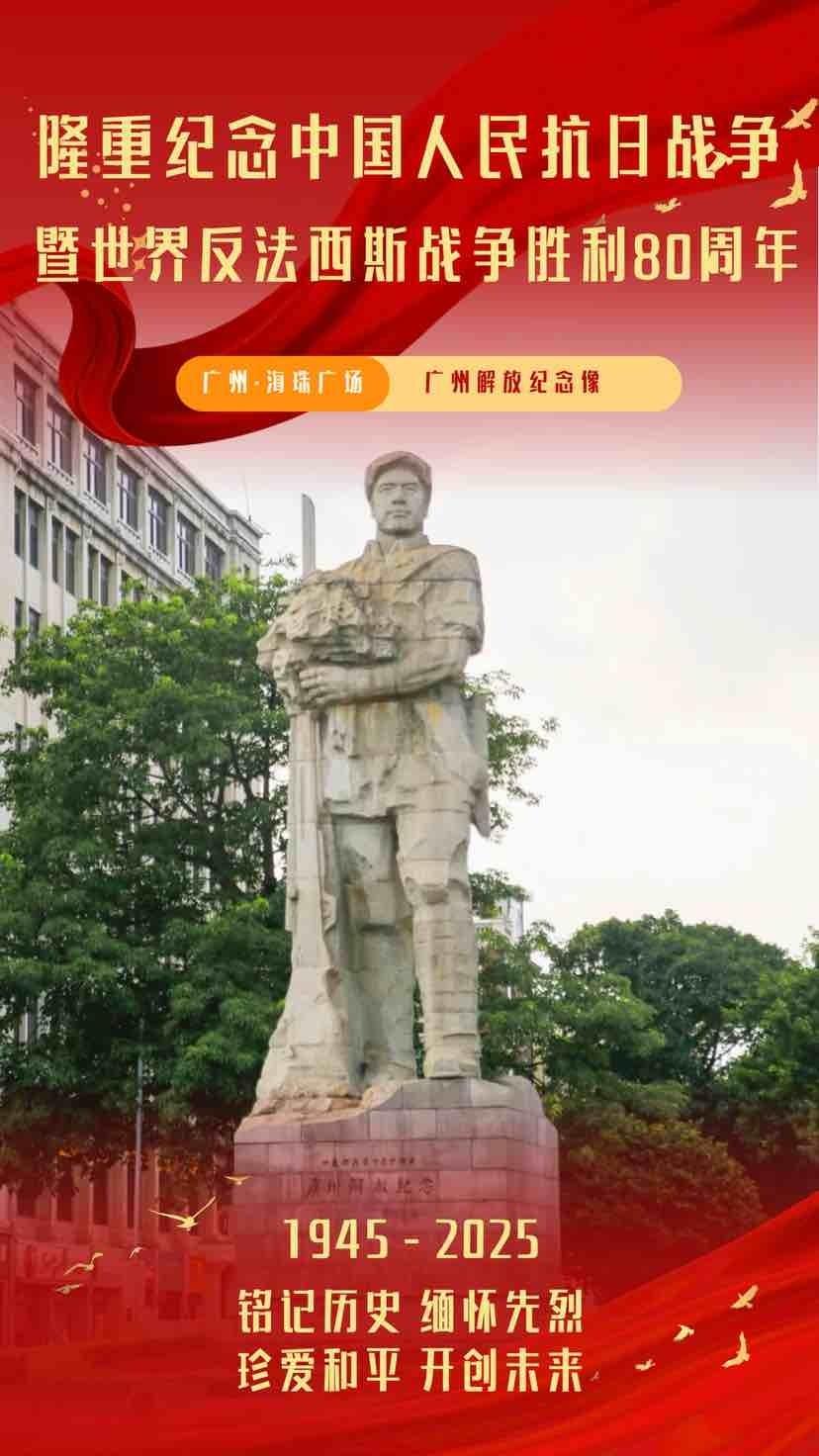 站在海珠广场,八十年岁月如流,脚下的土地仍回荡着抗战年代的铮铮回响,风中仍传颂着那段永不褪色的热血记忆。在抗日战争胜利80周年之际,我们致敬所有为家国奋战的英雄,是他们用生命换来了今天的山河无恙、和平光明。