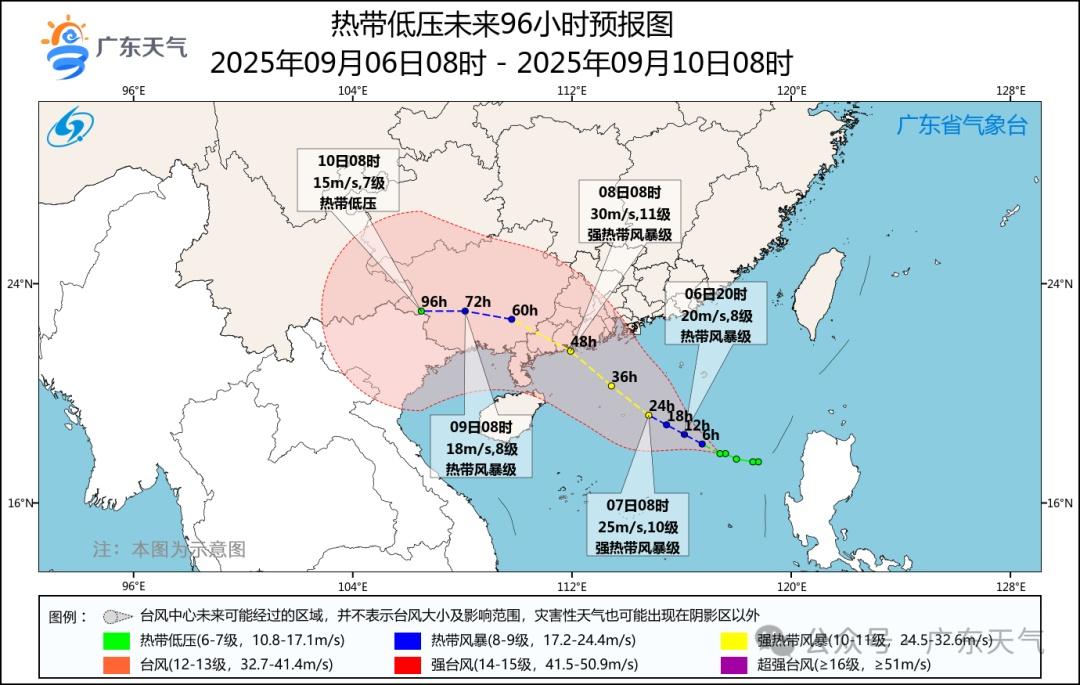 预计,热带低压将以10到15公里的时速向西北方向移动,强度逐渐加强,将于24小时内加强为今年第16号台风(热带风暴级),之后趋向我省中西部沿海,并将于8日在上述沿海登陆(强热带风暴级,10-11级)。