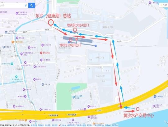 如市民选择自驾或打车前往,则可导航输入“黄沙水产中心”,如从1号门入,可选择东沙大道→汇盛路→环翠东路→翠园路→1号门这条路线;如从2号门入,可选择东沙大道→汇盛路→环翠东路→东沙路→2号门这条路线。