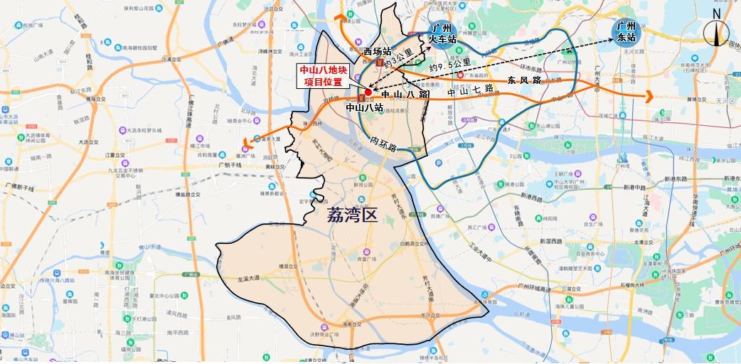 位于广州老城区的中山八地块位地理位置优越,紧邻地铁5号线、10号线中山八站,周边500米范围内共有公交线路46条,距离荔湾湖公园约200米,距离广州火车站约3公里。项目地块面积2.68公顷,北侧为塘前新街,南侧为房改房及铁路,西侧为房改房及内环路,东侧为现状居住用地。