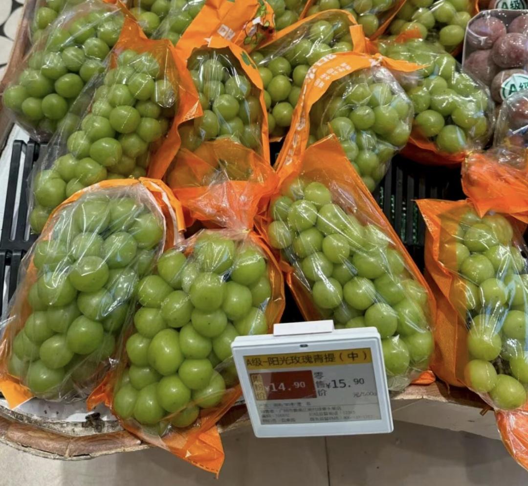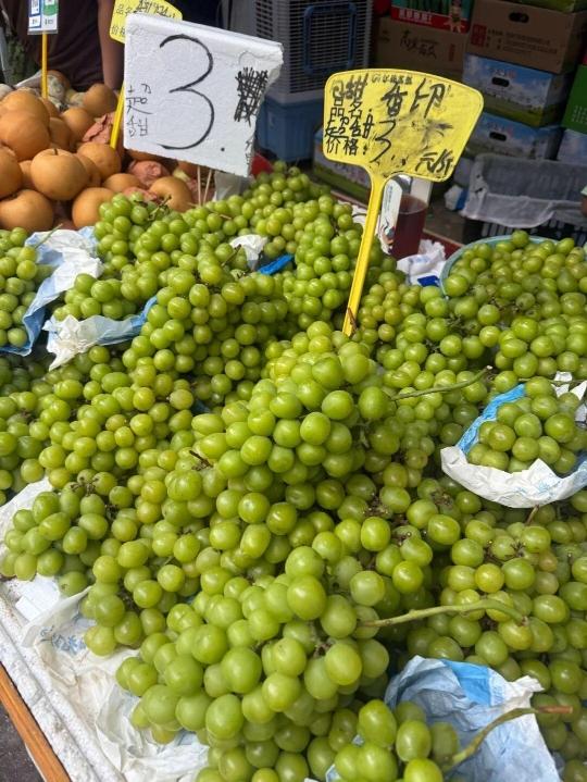 在传统农贸市场上,阳光玫瑰的价格下跌则更为明显。在广州西塱市场,记者发现市场水果摊位上青色饱满的阳光玫瑰几乎随处可见,占据显眼位置,价格普遍集中在每斤3-10元区间。