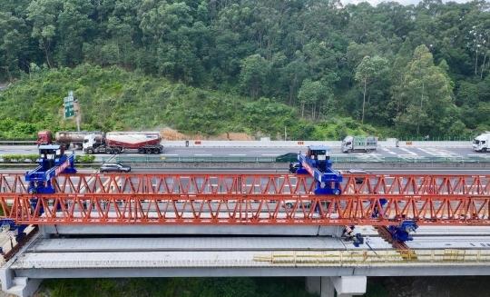 经过3个月的紧张施工,近日,随着最后一片长30米、重90吨的箱梁平稳精准落位在桥墩支座上,广东交通集团所属广韶高速改扩建项目(南段)和龙高架桥左幅94片箱梁全部架设完毕,标志着桥梁左幅实现贯通。