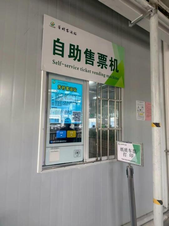 在芳村客运站附近,可以看到有不少为旅客设置的指引牌,顺着指引穿过一段长廊,便能看到一间简易搭建的候车室。候车室门口设置有自助购票机,屏幕上显示着,有前往江门、阳江、肇庆等地的省内班线;还有去往福建省、江西省等地的省际班线。旅客可直接扫二维码进行自助购票、取票。候车室内则设工作台,有工作人员为旅客提供人工售票、咨询等服务。