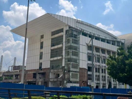 9月12日上午,记者来到位于荔湾区花地大道中的芳村客运站。远远便能看到,客运站主体大楼被蓝色铁皮围蔽,周围的栏杆贴有“正在施工,请勿靠近”的警示标语,提醒过往行人注意安全。从附近的天桥俯瞰,可以看到主体楼前的广场上停放有一台黄色挖掘机,周边堆积有一些建筑废料,还有几名工人在里面走动。客运站主体大楼将被拆除,部分墙面已露出内里的红砖。