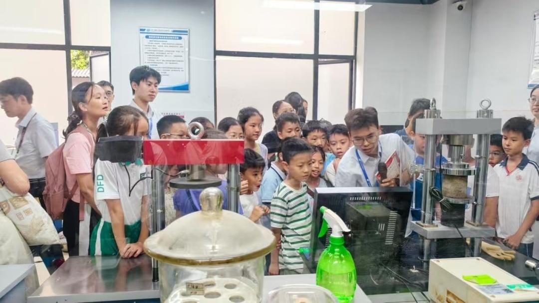 在“智慧实验室探秘”环节,由结构检测与材料分析工程师带队,亲子家庭近距离接触智能机械手、全自动压力试验机等高科技设备,现场观看混凝土与钢筋抗压强度测试过程。一位家长说:“第一次亲眼见到建设工程质量检测的黑科技,终于明白高楼大厦背后的安全是如何保障的了。”