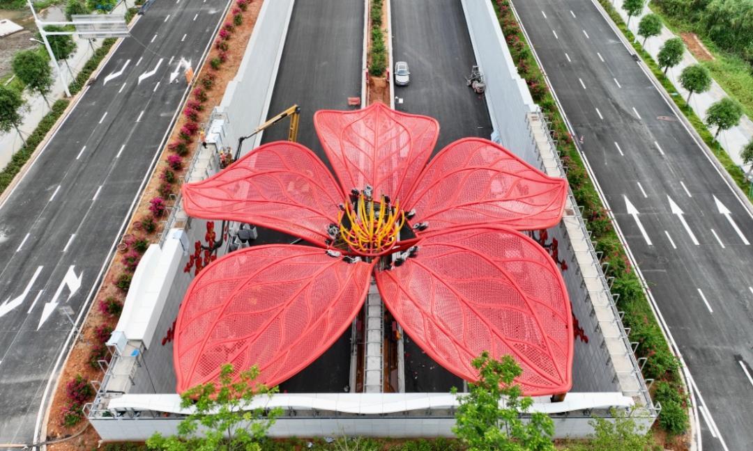 近日,有网友发现海珠湾隧道项目现场“绽放”出一朵巨型“木棉花”。21日,记者通过无人机航拍捕捉到这一标志性景观,在番禺区南浦附近的盾构隧道出入口,一朵以木棉花为原型的灯光装置已具轮廓,灯光框架与隧道口结构巧妙融合,既呼应了广州“市花”的城市符号,也为这座即将投用的重要交通工程注入了人文气息。施工人员正紧锣密鼓推进隧道洞口装饰等收尾工作。