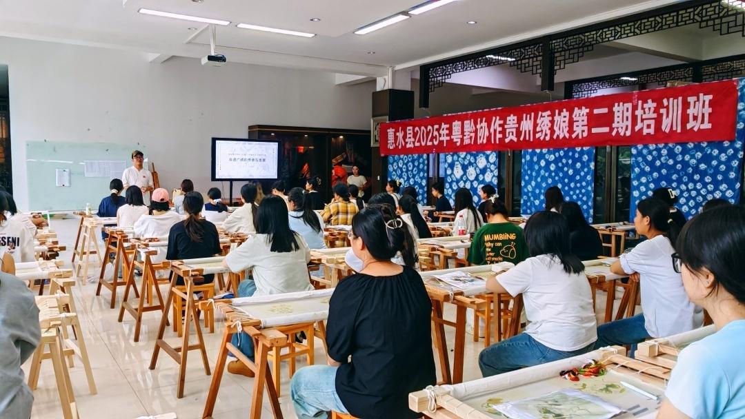 以往,广绣大多在家族成员、师徒之间口口相传、手把手教,这在新时代渐渐显现出“从业者老龄化、新生代不足”“会绣不会说、传授面不广”的被动局面。王新元很早意识到这一点,他建立广绣传承基地,持续开设广绣兴趣班、基础班,如今已带动400多位绣娘就业,包括300多个可居家接单的农村绣娘。此外,他带出80多名社会班的徒弟、100多名职业院校学生,推动更多有知识、有水平的年轻人加入进来,让广绣传承有了生力军。