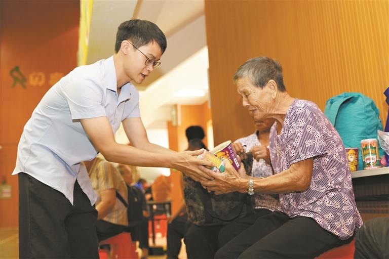 9月23日,在南沙金洲小学室内应急避护场所,工作人员给转移群众发放食物。