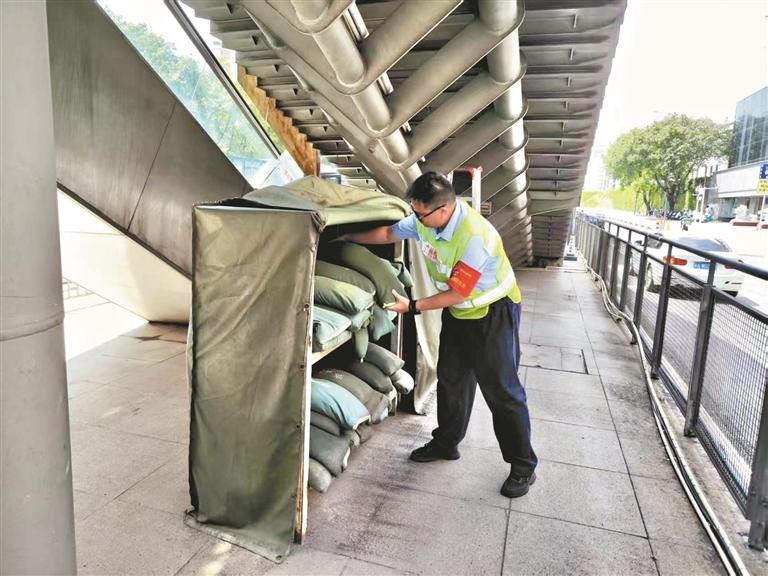 9月23日,广州公交集团下属巴士集团准备沙袋防御台风。