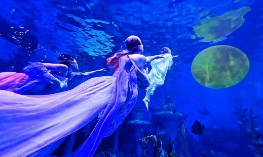 广州海洋馆还特邀广州杂技团献演杂技剧《哪吒闹海·海底龙宫》,将高超技艺与海洋场景完美结合,重现经典神话故事。全新人鱼演艺《嫦娥筑梦》唯美上演,人鱼化身嫦娥演绎海底逐月,致敬中国航天逐梦九天的豪情壮志;《梦启深海·跃动全运》则创新演绎“水中艺术体操”,将体育元素与水下表演巧妙融合,喜迎十五运。国庆特别推出《舞献华彩》系列舞蹈,来自不同朝代的美人穿越到海洋世界,京剧、古典、唐风、民族特色舞蹈轮番上演,以华丽舞蹈献礼国庆。