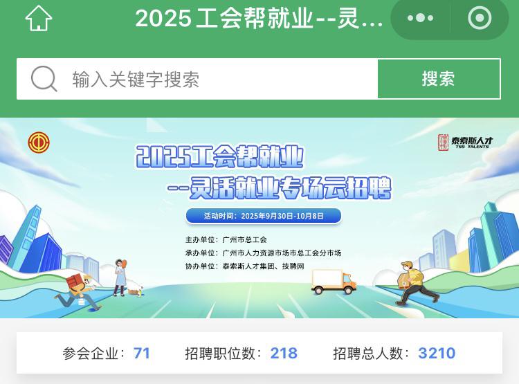 记者今日获悉,9月30日-10月8日,由广州市总工会主办、广州市人力资源市场市总工会分市场承办的2025工会帮就业——灵活就业专场云招聘将开展。