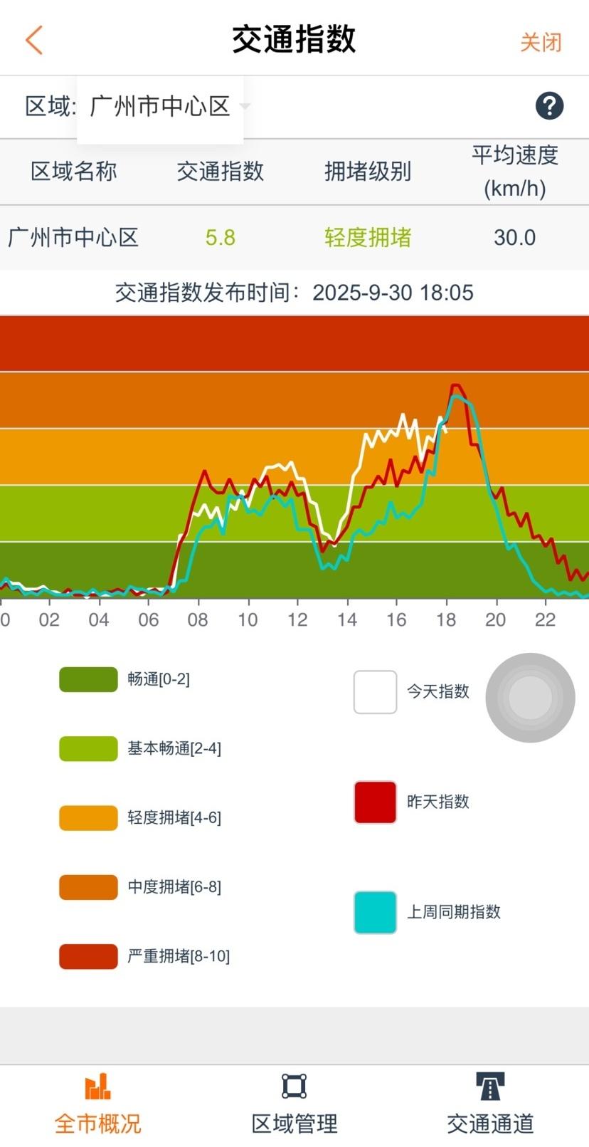 中秋国庆假期前一天,广州迎来出行高峰。9月30日下午,广州市中心区交通指数持续攀升,多个区域和主干道出现“严重拥堵”,部分时段与昨日同期相比,拥堵级别高出一级;与上周同期相比,拥堵级别高出两级。