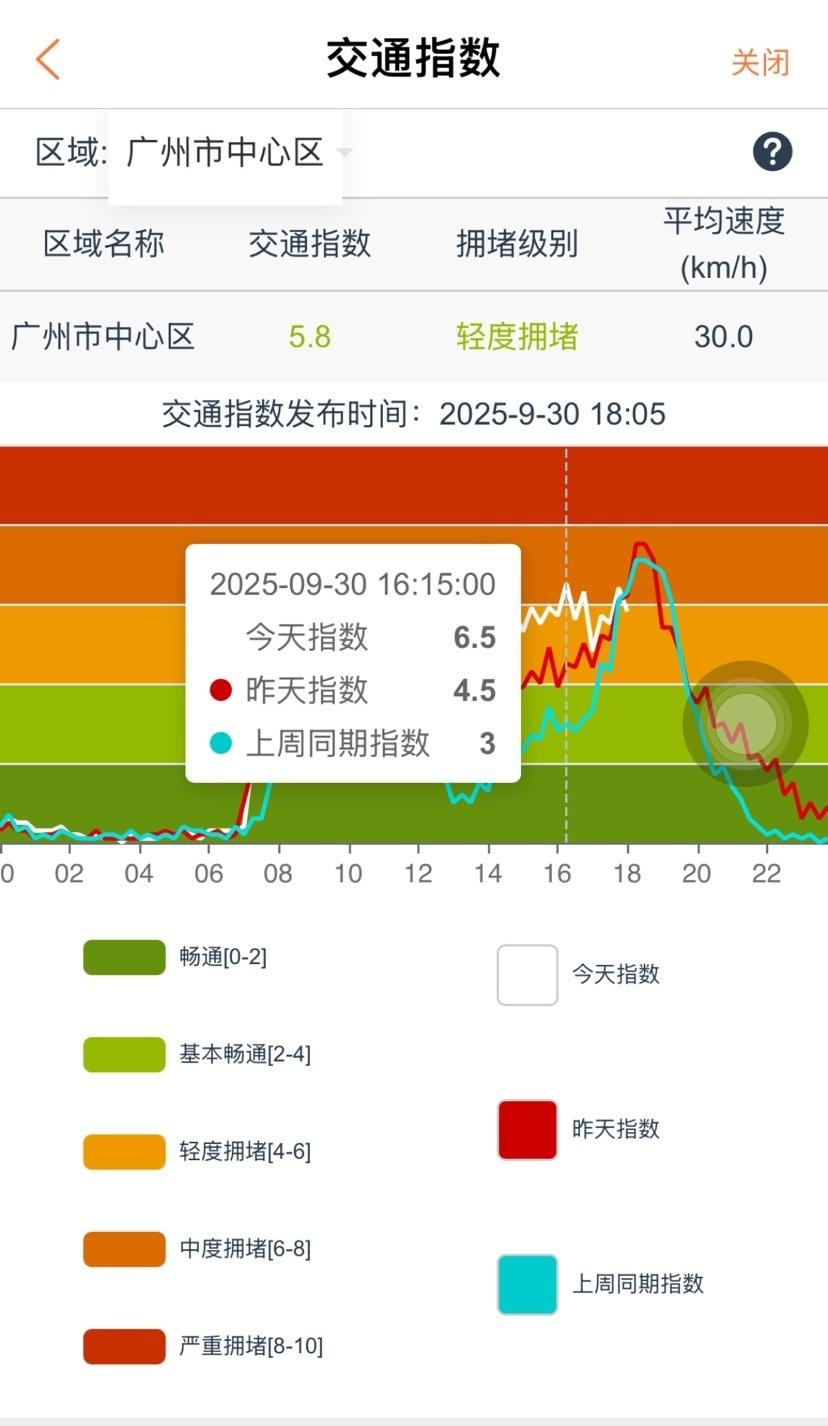 广州交通行讯通显示,从13时30分开始,广州市中心区交通指数持续升高。14时15分广州市中心区今日交通指数(下同)为4.3,拥堵级别为轻度拥堵;昨日交通指数为3.2,为基本畅通级别。16时15分,今日交通指数升至阶段性峰值6.5,拥堵级别为中度拥堵;昨日交通指数为4.5,属于轻度拥堵;上周同期指数为3,拥堵级别为基本畅通。随后交通指数呈波浪形变化,17时45分再至中度拥堵级别。从具体区域来看,18时15分,昌岗、车陂员村、天河商圈等区域为严重拥堵。从交通通道来看,东风路(东—西)、江海大道—猎德路(南—北)等为严重拥堵。