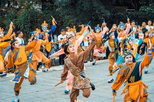 岭南印象园「英歌・火舞,穿月岭南」游园会 ,日夜不间断,民俗与潮玩碰撞。英歌舞,锣鼓声里的生命力。假期期间,每天4场不容错过 !