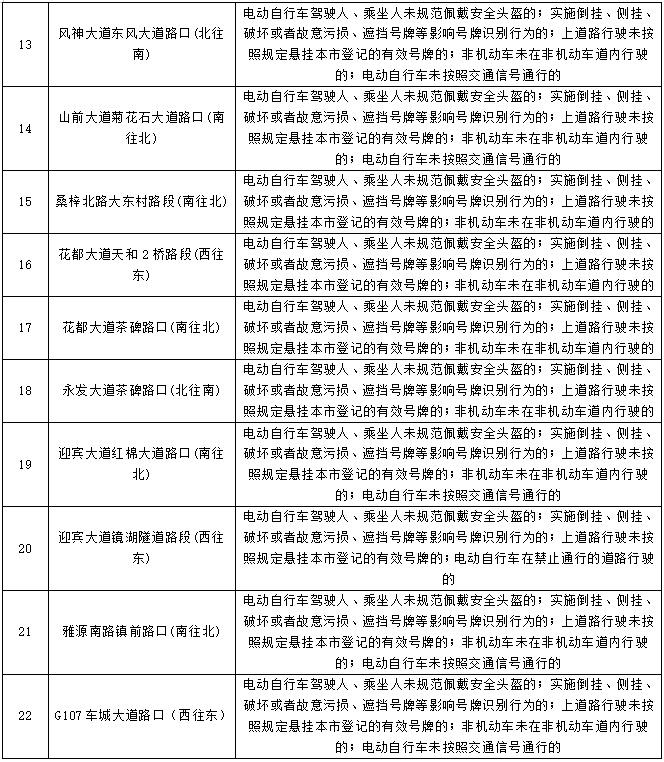 记者从公安机关交通管理部门获悉,为进一步加强道路交通安全管理,保障道路交通安全、畅通、有序,交管部门近日公布广州市花都区22个电动自行车交通违法行为抓拍取证点位,将依法对有交通违法行为的电动自行车进行拍摄取证并予以执法,请广大电动自行车驾驶人守法出行、安全驾驶。
