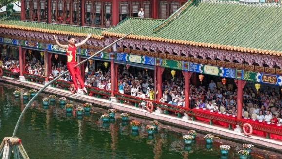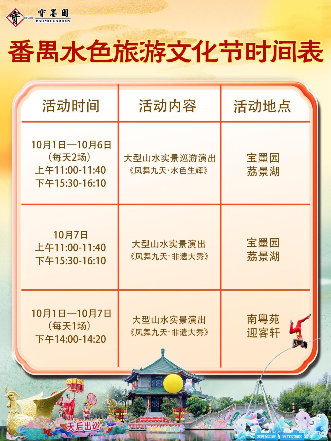 据了解,宝墨园第八届番禺水色旅游文化节将持续至10月7日,期间宝墨园每日11:00、15:30将上演两场展演(10月1日—6日为《凤舞九天‧水色生辉》、10月7日为《凤舞九天・非遗大秀》),南粤苑每日下午也将同步推出实景表演,让游客在整个黄金周期间沉浸式感受非遗魅力,共庆双节、喜迎全运。