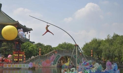 岸上的聚宝桥同样热闹非凡。身着嫦娥服饰的演员翩翩起舞,彩色长绸随风翻飞,与古建檐角的大型玉兔揽月灯组交相辉映,“彩云追月”的唯美意境悄然呈现。