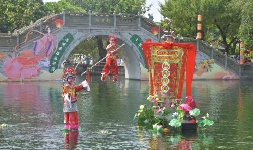 “天籁之音”中,小演员们身着精致戏服,依靠宝墨园创新的半浮潜舢板技术,在水面“凌波而立”,宛如悬浮于碧波之上,灵动的模样让观众啧啧称奇;“包公出巡”“哪吒伏魔”“青萝三凤”等经典水色表演轮番上演,小演员们动作细腻、表情生动,将传统故事场景还原得栩栩如生,尽显番禺水色这一非遗技艺的独特魅力。