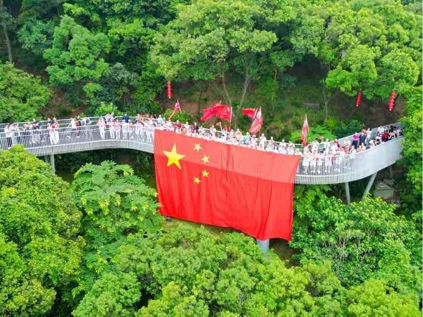 摩星岭景区与群众团体在云山之巅共同开展“青春红歌快闪”活动,以炙热的歌声礼颂祖国华诞,并在观光电梯栈道共同展开一面巨型五星红旗。这一刻,红旗飘扬映青山,浓情四溢颂祖国。